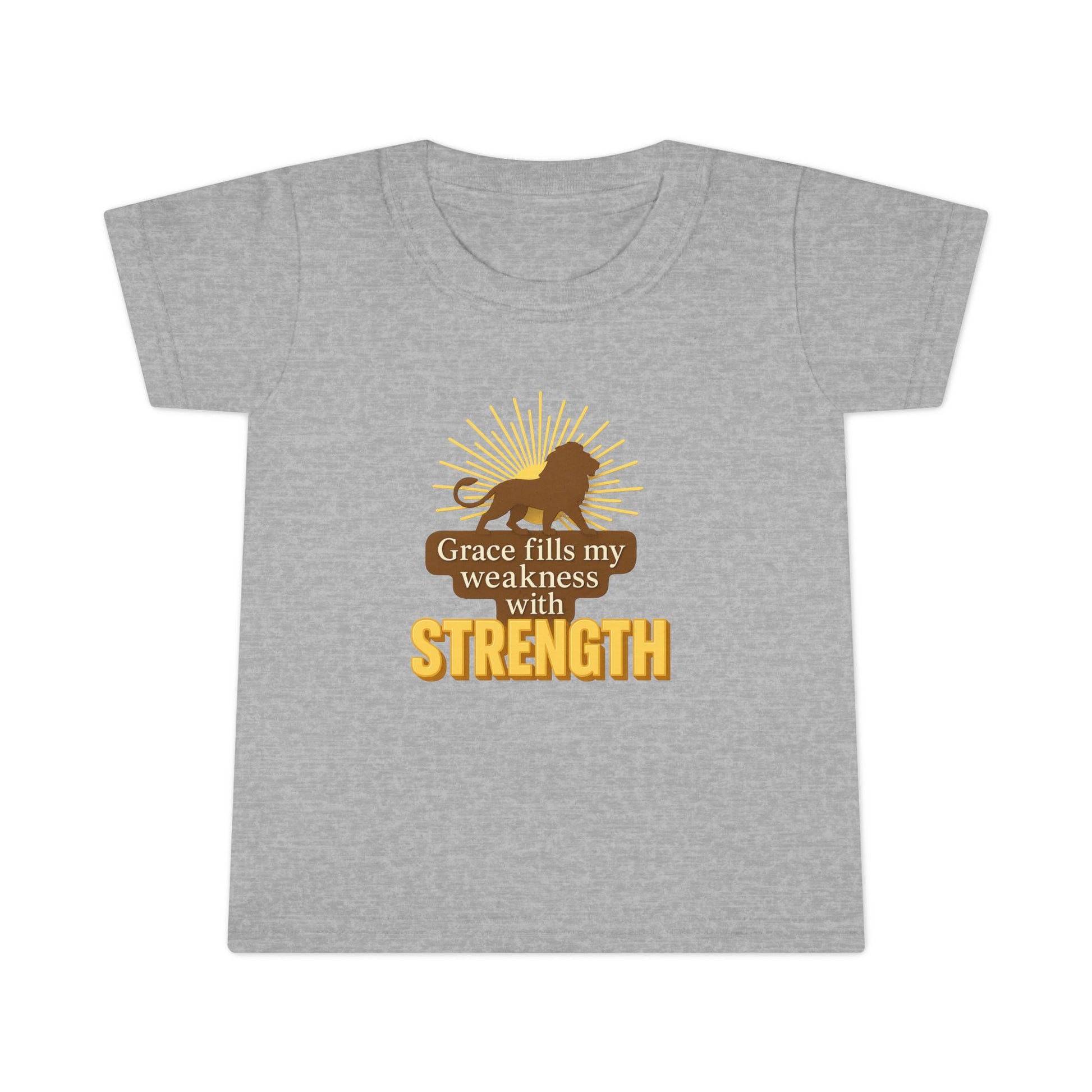Soft, lightweight, and made for little ones always on the move, this toddler tee blends comfort with a message of quiet strength. A bold yet gentle lion graphic, crowned with sunburst rays, frames the words “Grace fills my weakness with strength,” printed in warm golden and earthy brown tones against a versatile heather-gray backdrop.